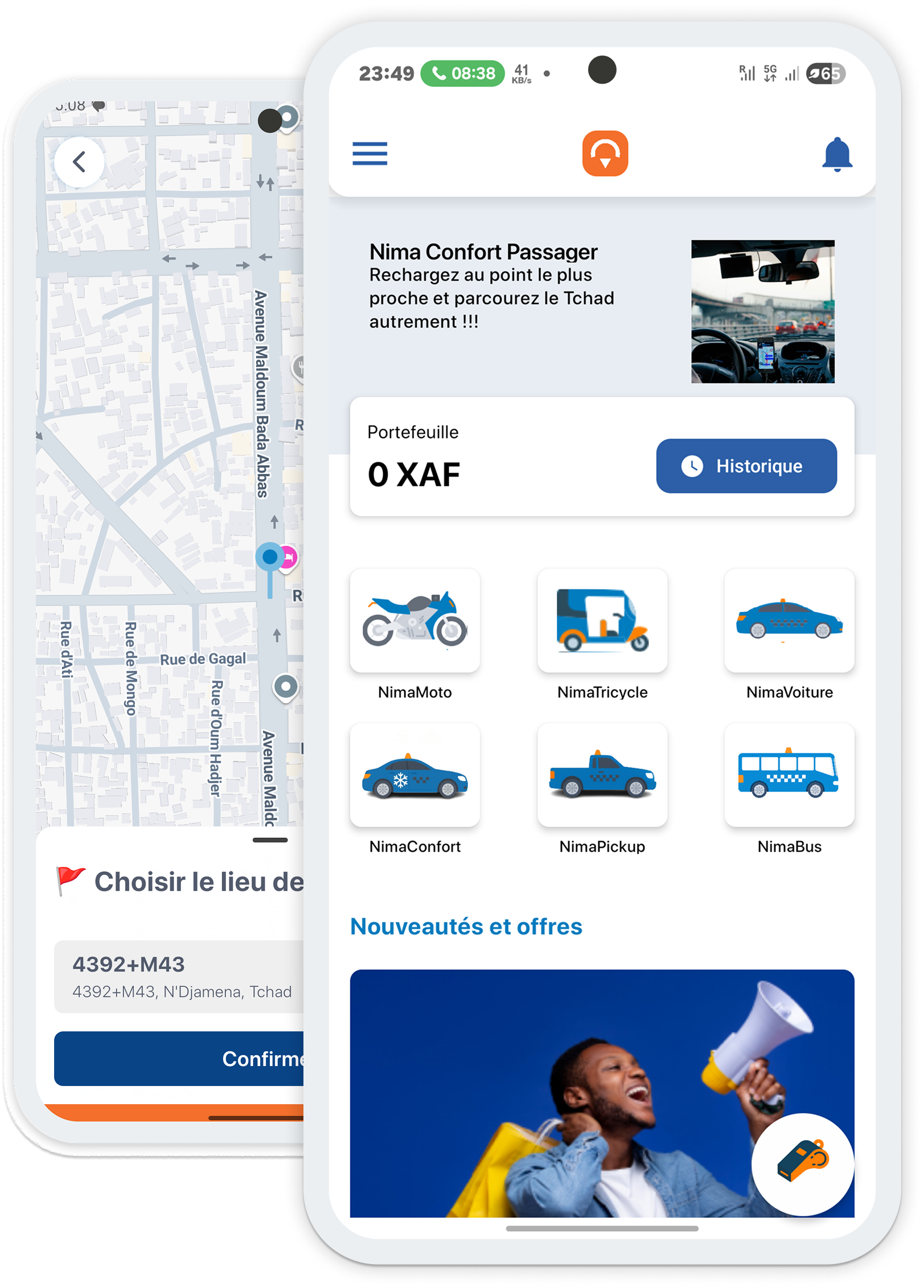 Télécharge l’application NIMA CONFORT gratuitement sur Google Play. En quelques secondes, tu as entre tes mains l’accès à une nouvelle façon de te déplacer à N’Djamena – plus moderne, plus fiable, plus confortable. (Disponible bientôt sur App Store)